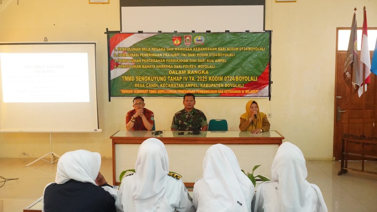 Bataviainews.com Boyolali – Sadar akan pentingnya menumbuhkan jiwa nasionalisme sejak dini, Satgas TNI Manunggal Membangun Desa (TMMD) Sengkuyung Tahap IV Tahun 2025 Kodim 0724/Boyolali memberikan sosialisasi bela negara dan wawasan kebangsaan kepada siswa-siswi SMA Negeri 1 Ampel, Kecamatan Ampel, Kabupaten Boyolali, Senin (13/10/25).