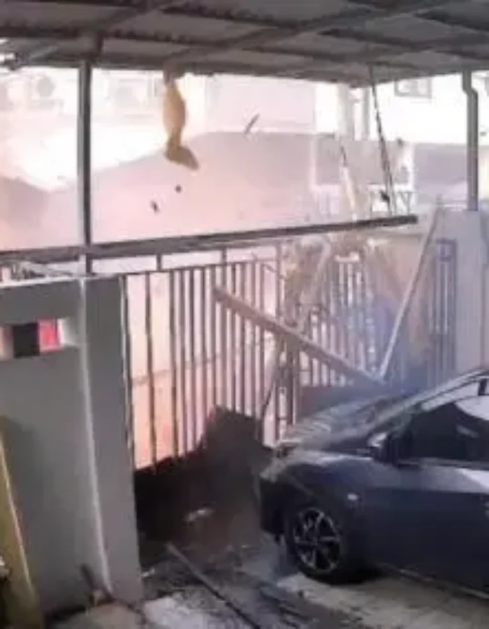 Kejadian dramatis ini terekam jelas oleh kamera CCTV milik rumah yang berada tepat di depan lokasi ledakan. Dalam rekaman tersebut, tampak seorang pria mengenakan kemeja batik sedang bermain ponsel di garasi rumahnya.