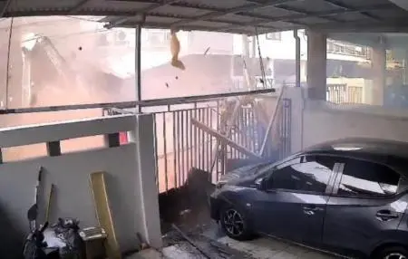 Saat pria tersebut hendak masuk ke dalam rumah, tiba-tiba ledakan dahsyat terjadi di rumah berwarna merah muda di seberangnya. Puing-puing bangunan beterbangan ke segala arah akibat kekuatan ledakan. Bahkan pagar rumah di depannya ikut rusak tertimpa reruntuhan.