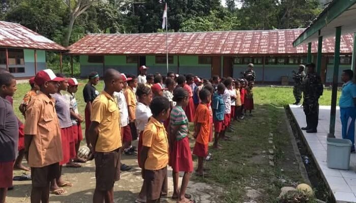 Tumbuhkan Jiwa Nasionalisme dan Cinta Tanah Air, Satgas Pamtas RI-PNG Statis Yonif 643/Wns Latihkan SD Inpres Baris-Berbaris dalam Rangka Upacara Bendera
